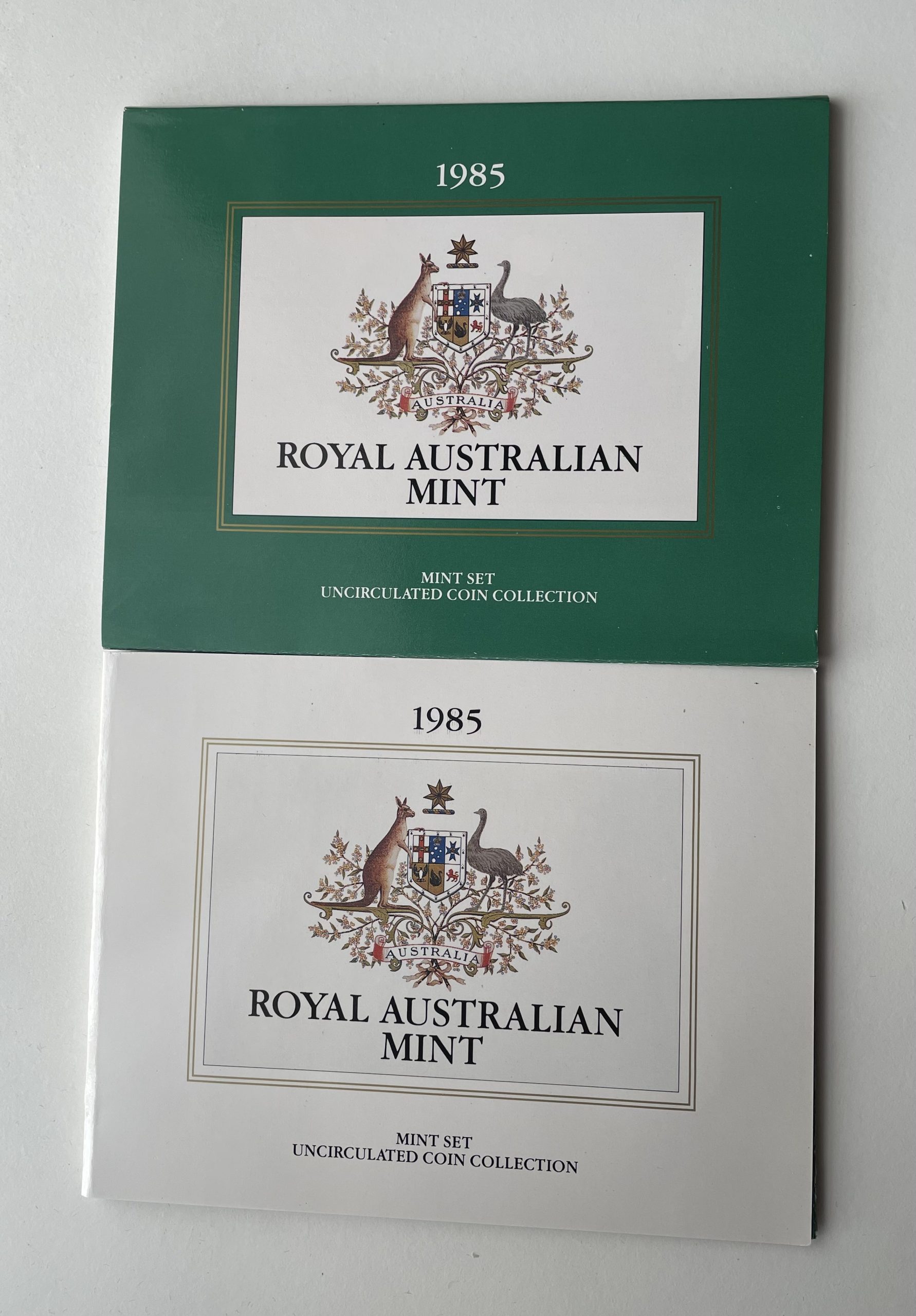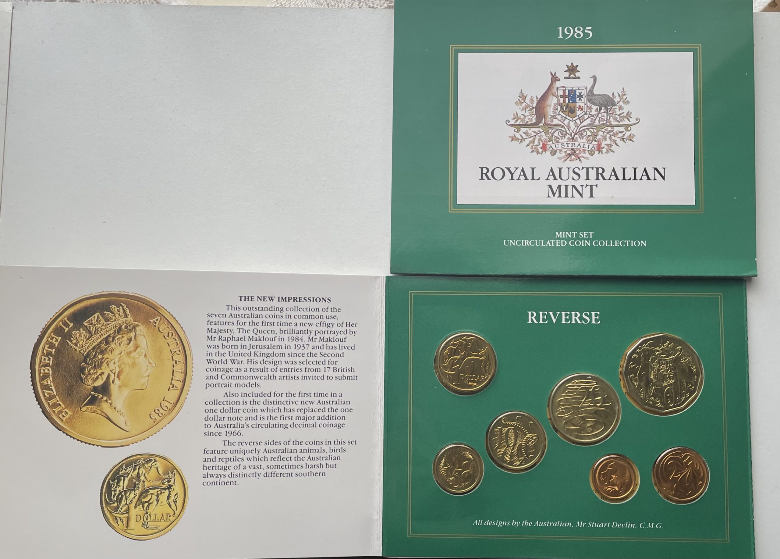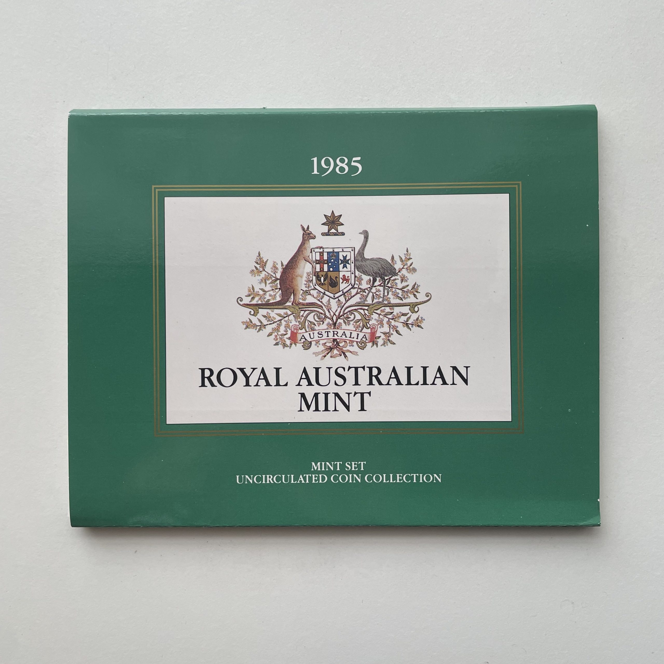 The 1985 uncirculated mint set from the Royal Australian Mint. Due to age, plastic is slightly yellow.