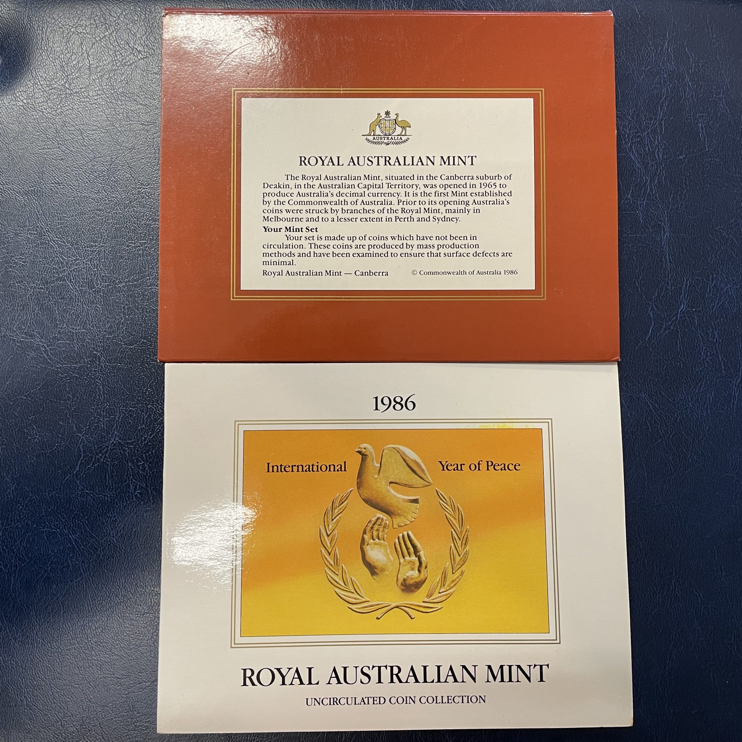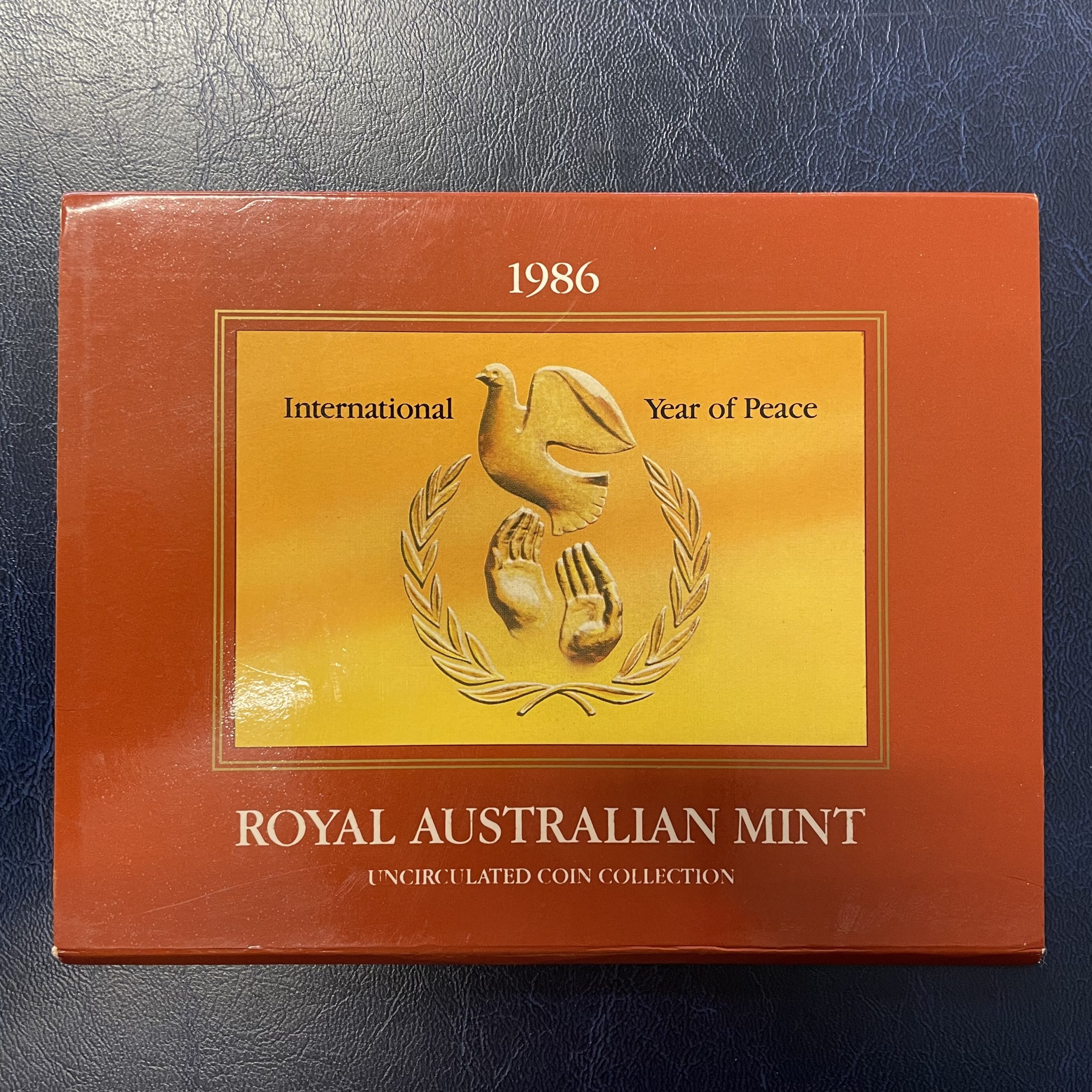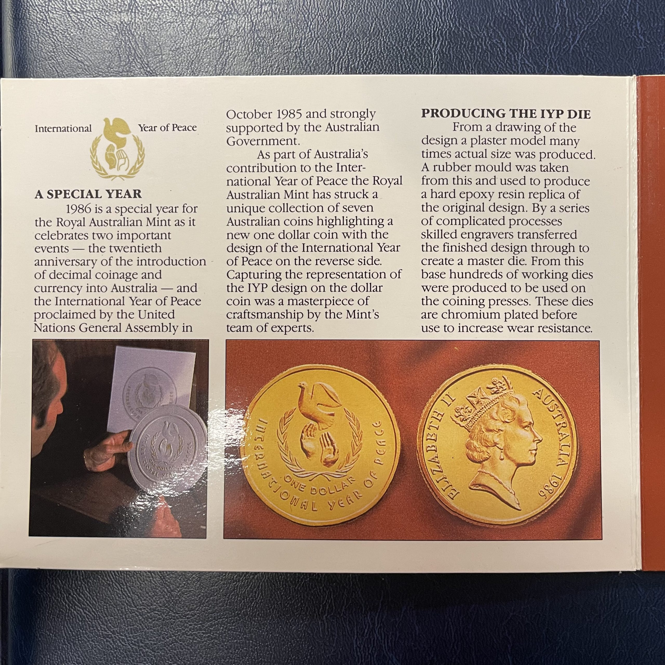 The 1986 7 coin mint set celebrates the international year of peace as well as the 12th anniversary of the introduction of decimal coinage, with a special $1 coin with the design of the International Year of Peace on the reverse side.