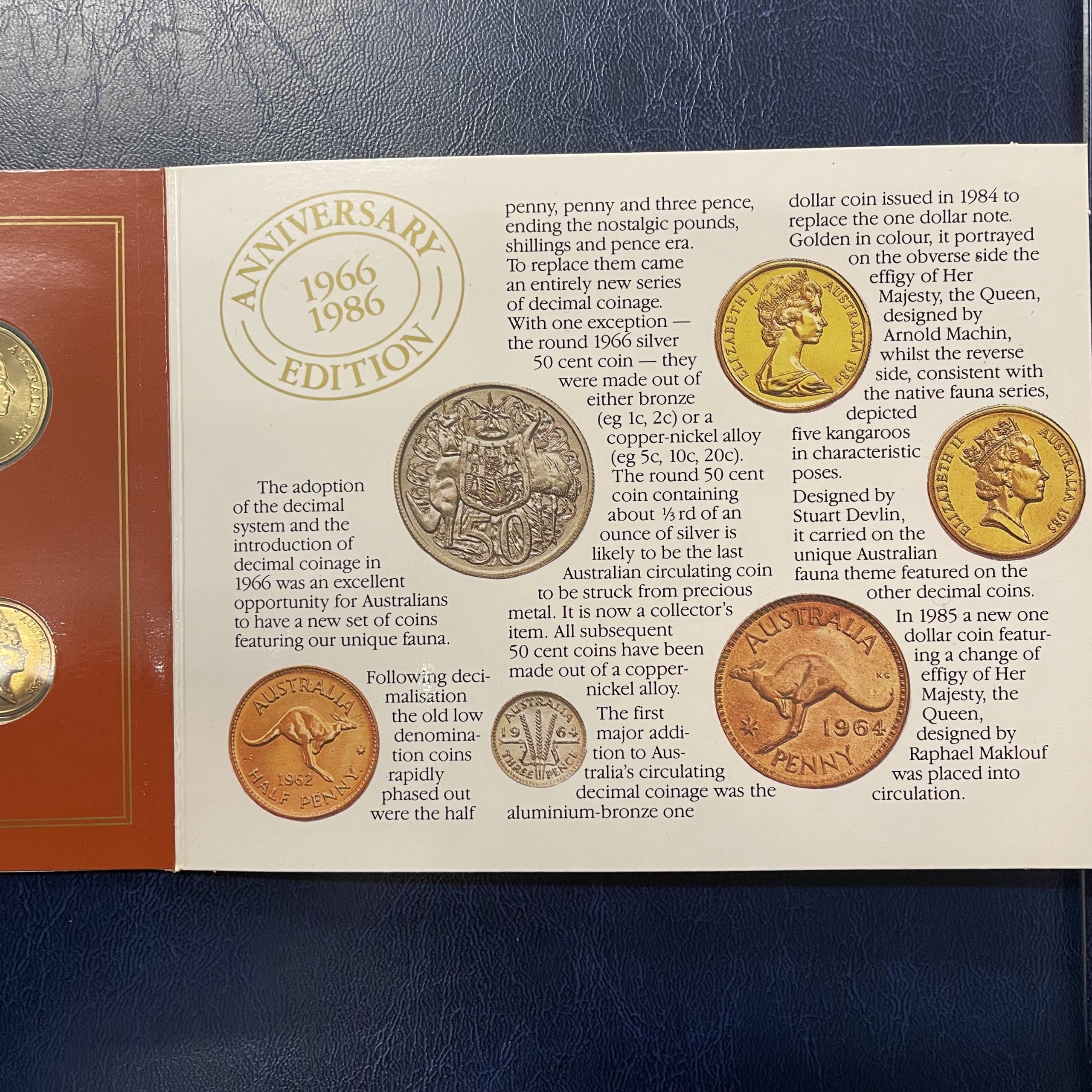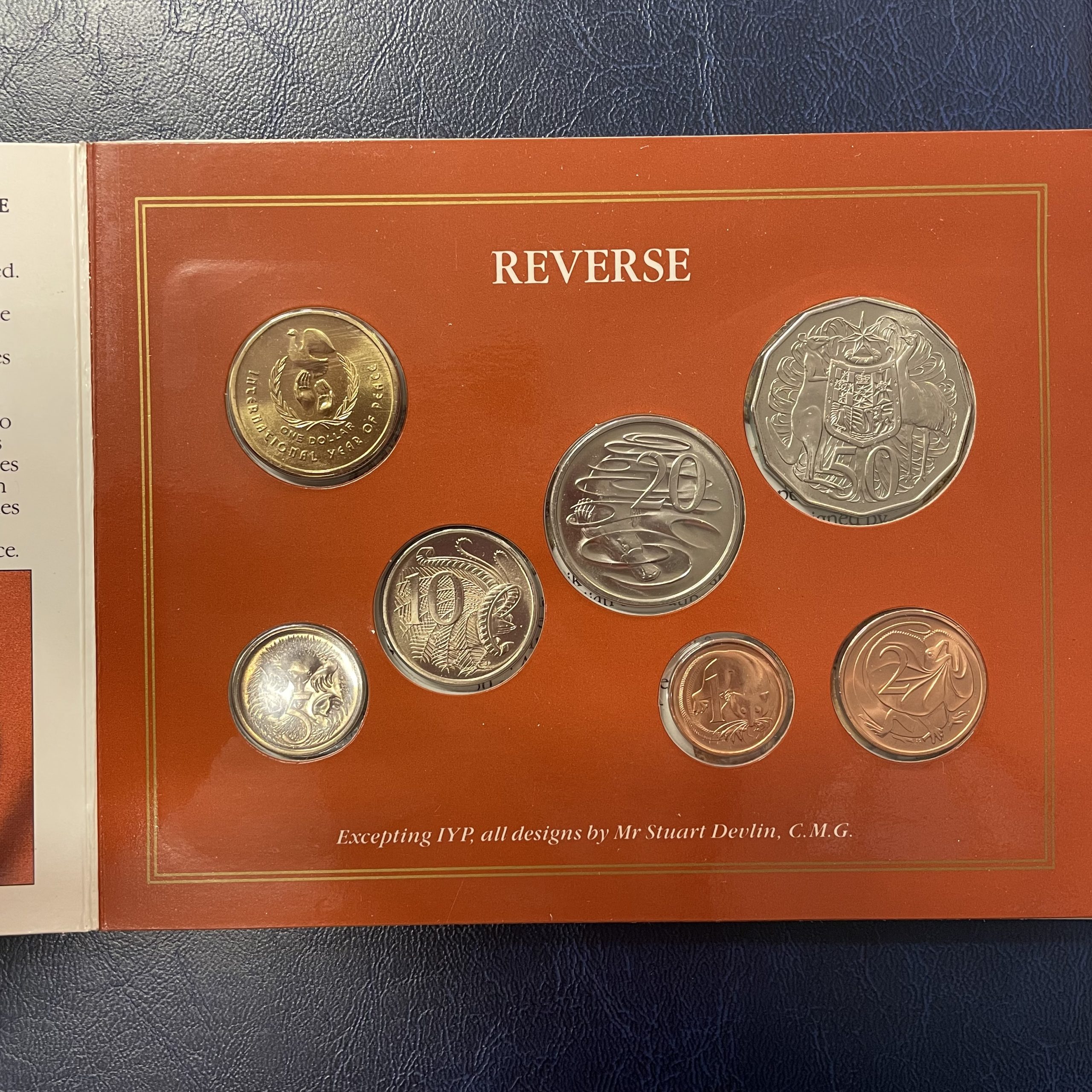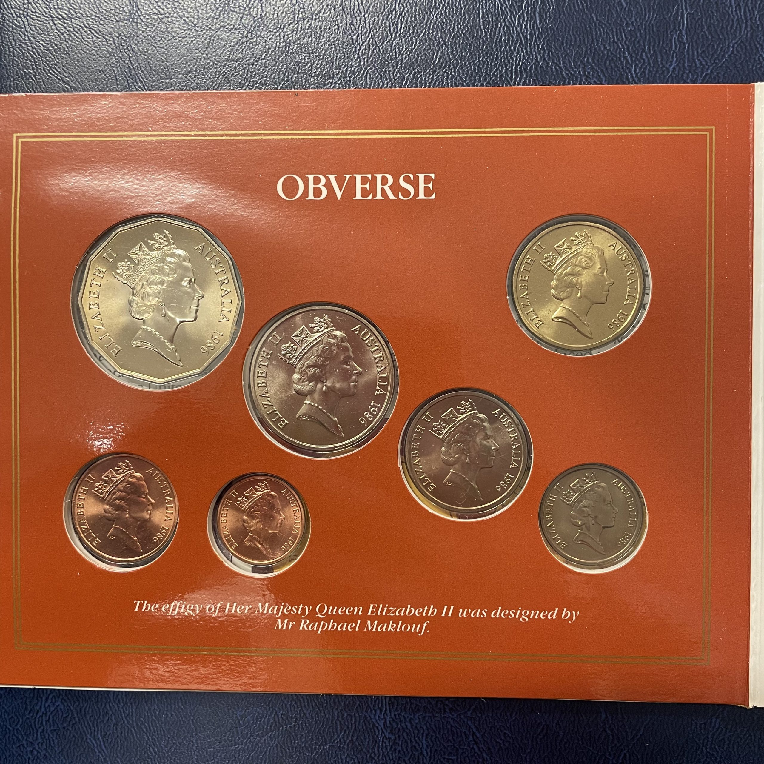 The 1986 7 coin mint set celebrates the international year of peace as well as the 12th anniversary of the introduction of decimal coinage, with a special $1 coin with the design of the International Year of Peace on the reverse side.