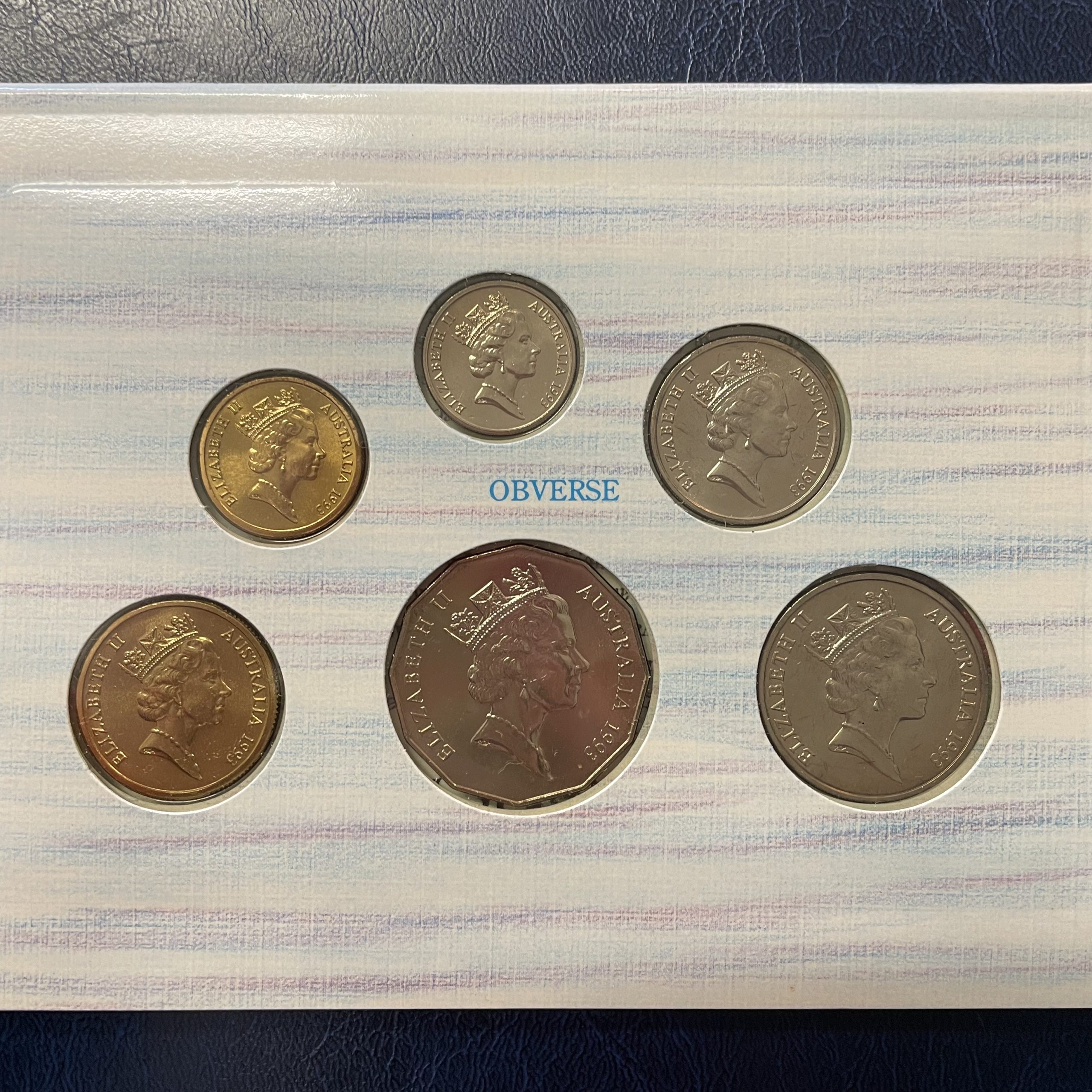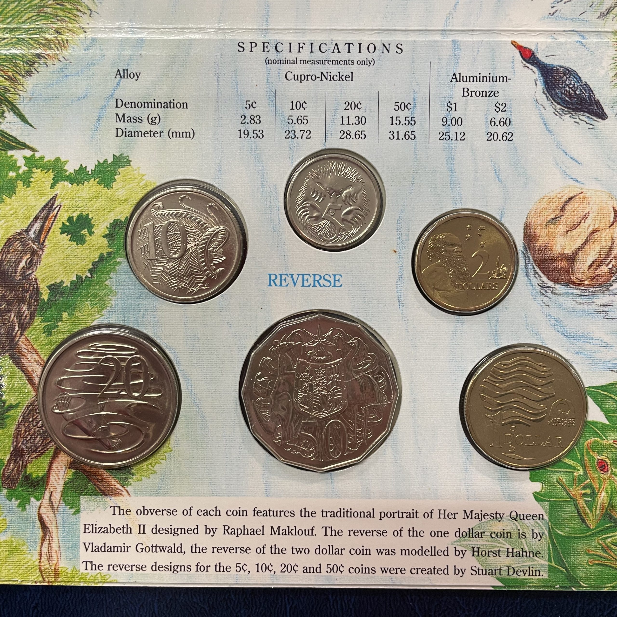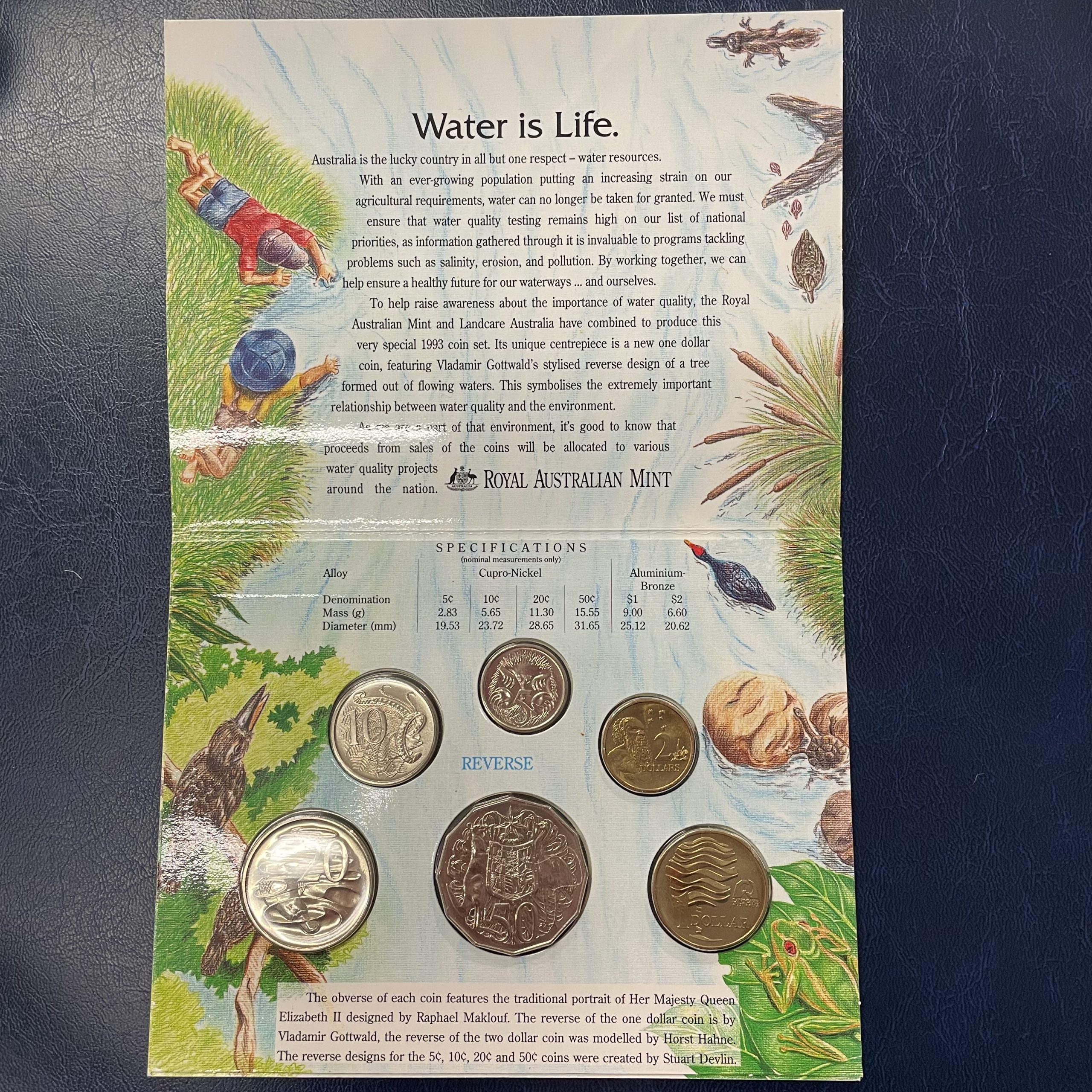 The 1993 6 coin mint set has a ‘hand-coloured’ theme and focuses on the theme of water. It was produced with Landcare Australia and features a special $1 coin with a reverse of a “tree formed out of flowing waters”.
