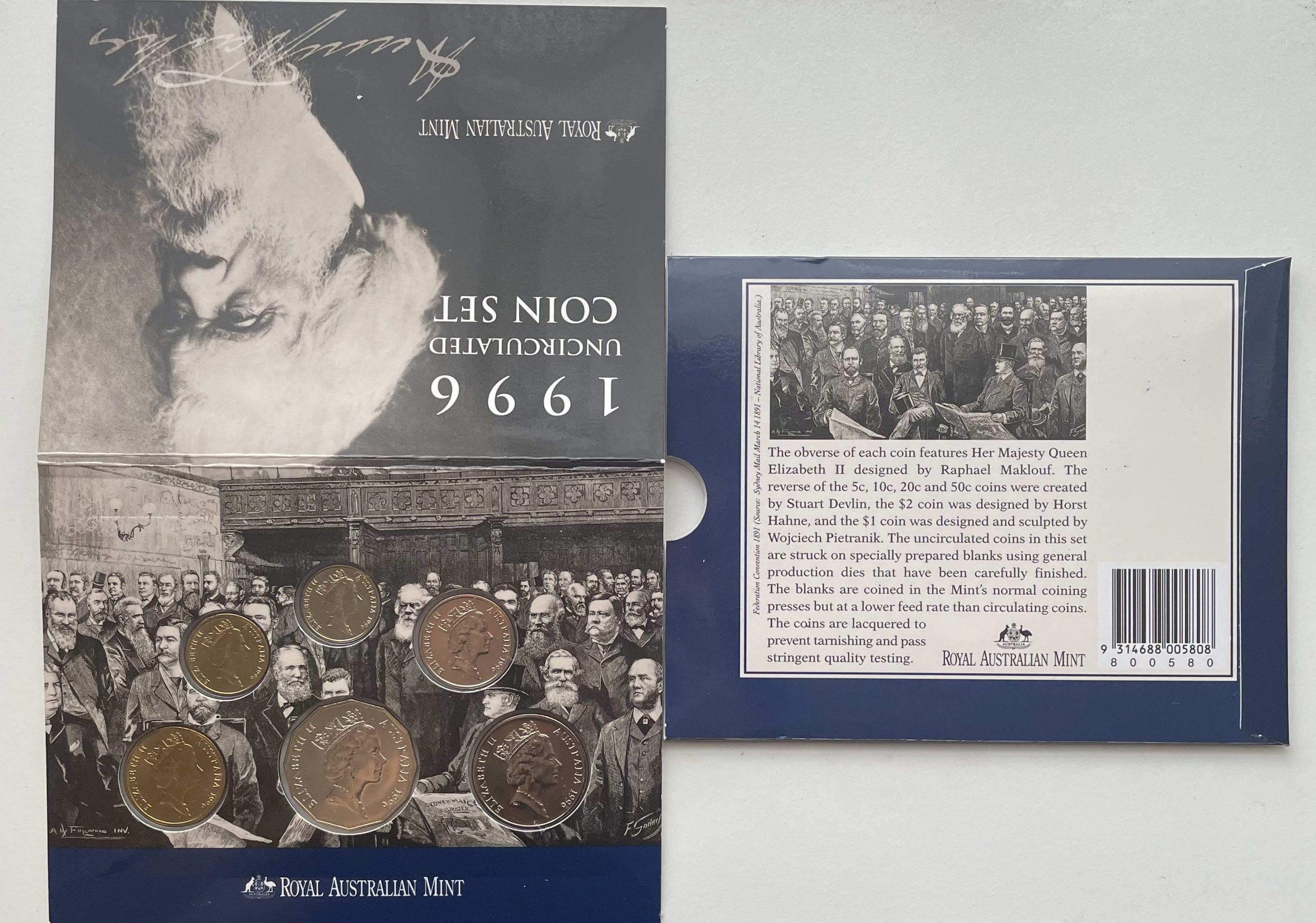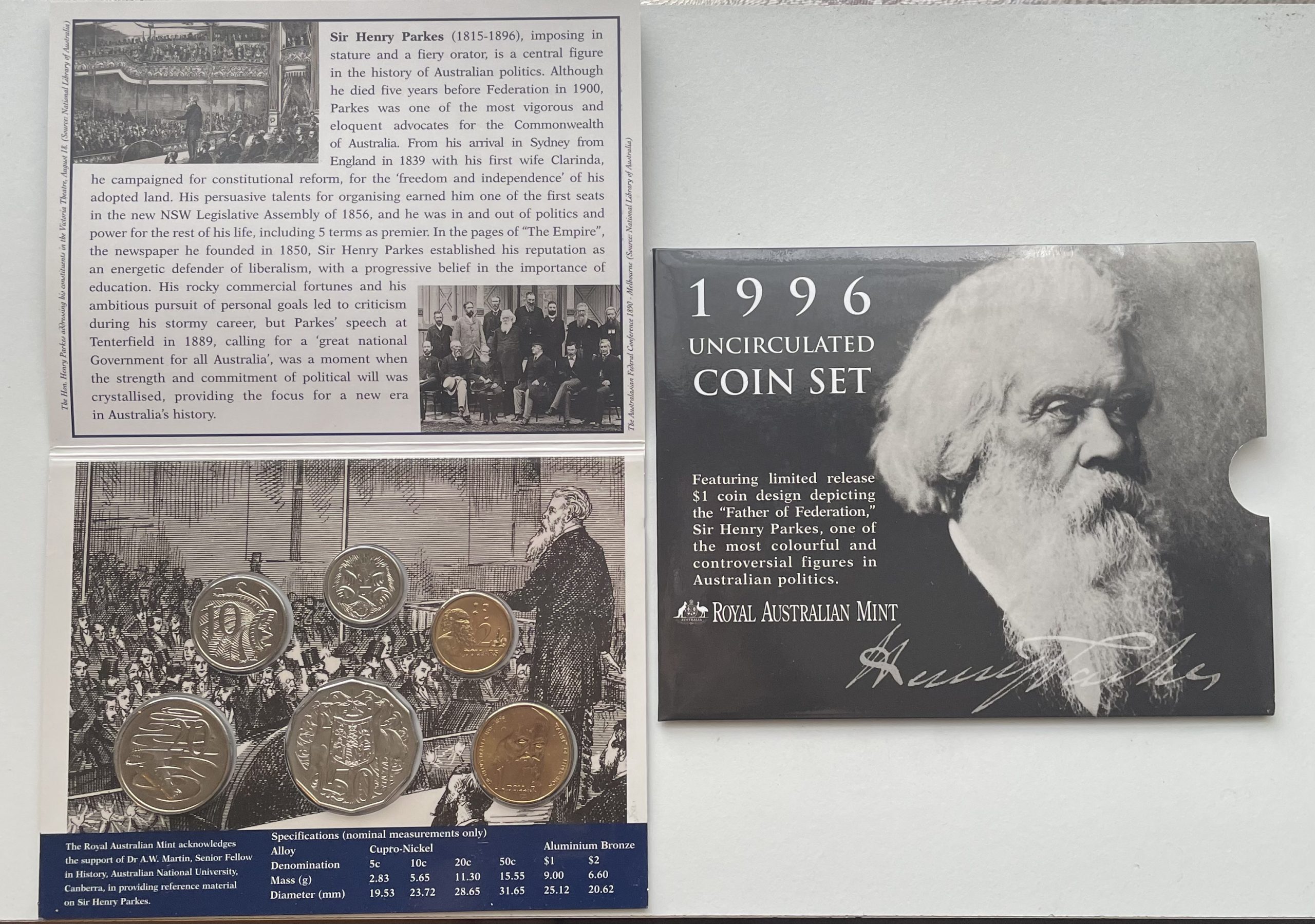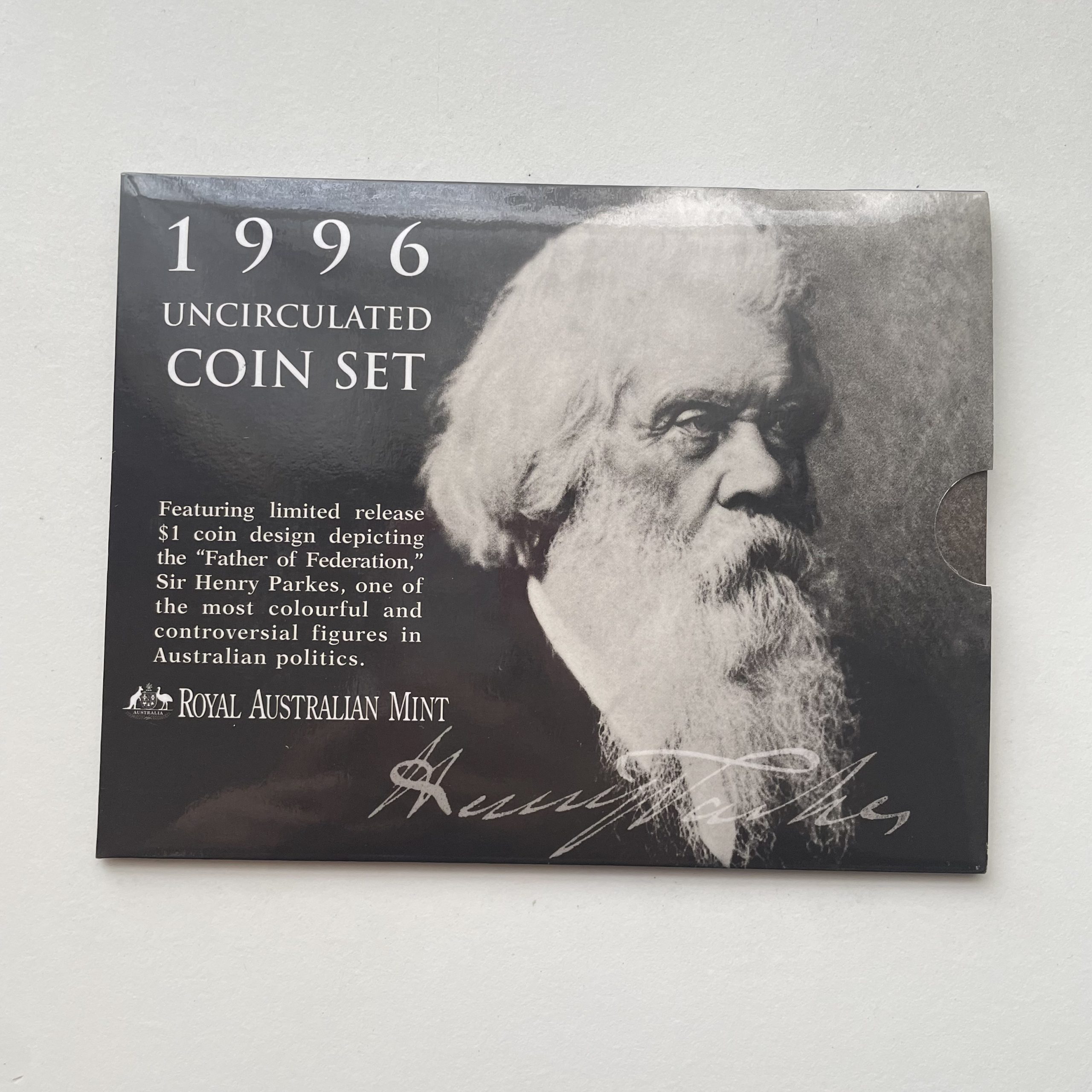 The 1996 uncirculated mint set from the Royal Australian Mint. This set features a limited release $1 depicting the ‘Father of federation’, Sir Henry Parkes.